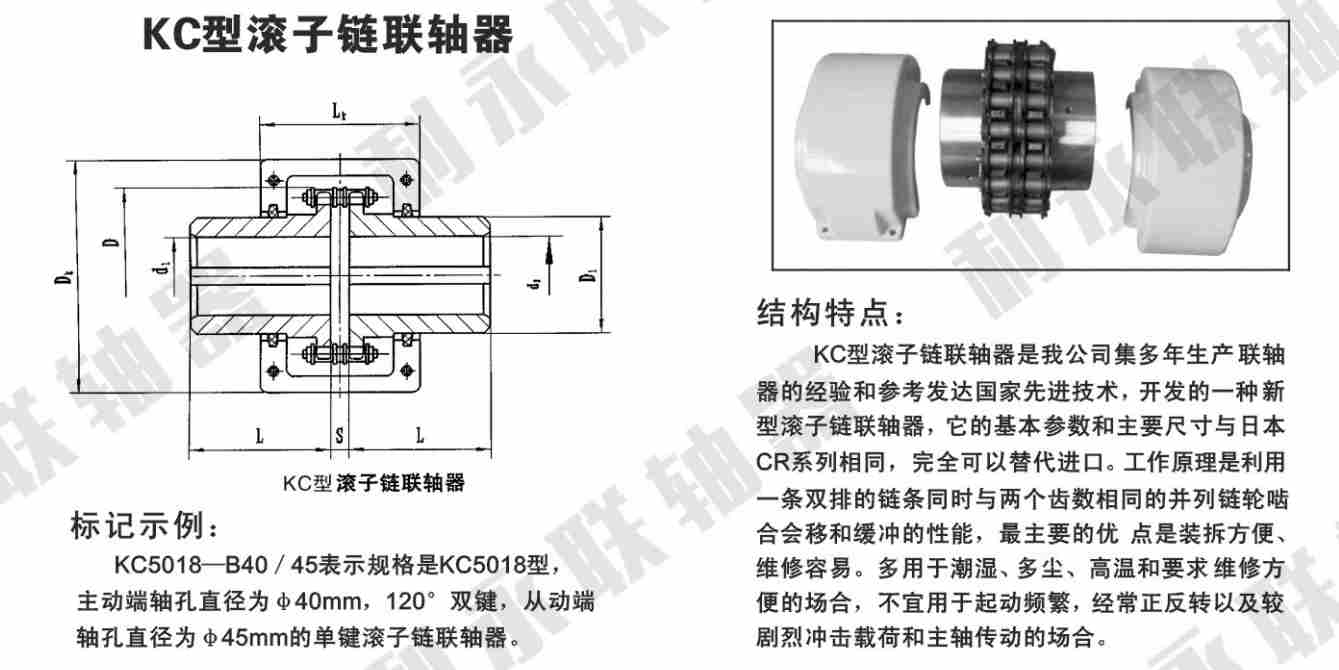 KC滾系鏈聯(lián)軸器可用于紡織、農(nóng)機、起重運輸、工程、礦山、輕工、化工等機械的軸系傳動,適用于高溫、潮濕和多塵啟動頻繁,經(jīng)常正反轉(zhuǎn),以及較劇烈沖擊載荷和扭振的場合,不適用高速和傳遞軸向力的場合,鏈條聯(lián)軸器應(yīng)在良好的潤滑并有防護罩的條件下工作。鏈條聯(lián)軸器主要由一條鏈條及兩鏈輪式半聯(lián)軸器組成。一條公用的鏈條同時與兩個齒數(shù)相同的并列鏈輪嚙合,實現(xiàn)了兩半聯(lián)軸器的聯(lián)