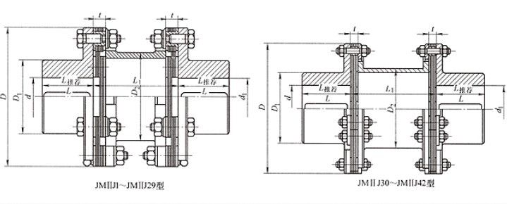 JNIJ中間軸型膜片聯軸器適用于高溫、高速、有腐蝕介質工況環境的軸系傳動,廣泛用于各種機械裝置的軸系傳動,如水泵(尤其是大功率、化工泵)、風機、壓縮機、液壓機械、石油機械、印刷機械、紡織機械、化工機械、礦山機械、冶金機械、航空(直升飛機)、艦艇高速動力傳動系統,經動平衡后應用于高速傳動軸系已比較普遍。與齒式聯軸器相比,沒有相對滑動,不需要潤滑、密封,無噪聲,基本不用維修,制造較方便,可部分代替齒式聯軸器,膜片聯軸器在口碑上工業發達家園應用已很普遍,在實際應用中一般采用接中間軸型,以提高兩軸線偏移補償性能。