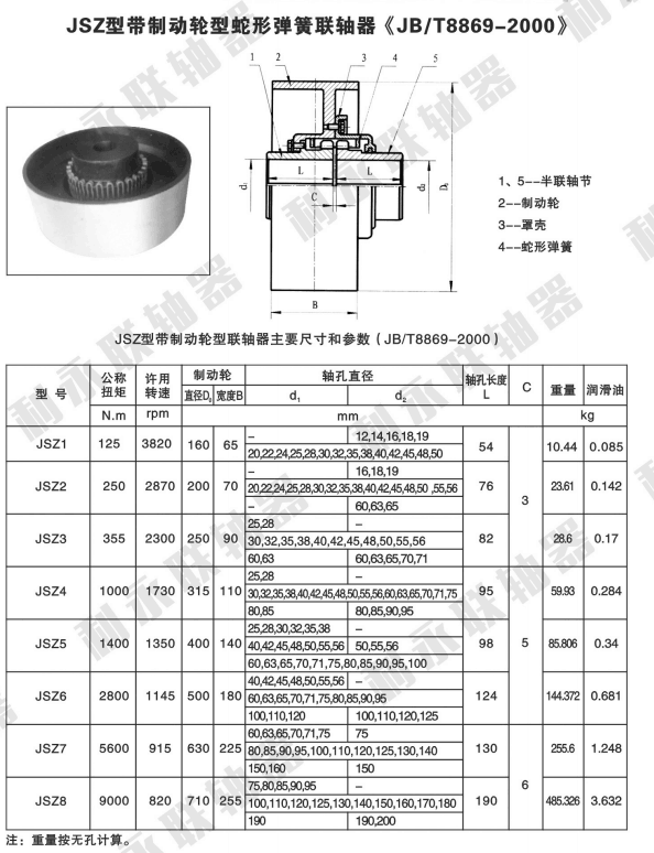 JSZ帶制動輪型蛇形彈簧聯軸器結構簡單,徑向尺寸小,重量輕,轉動慣量小,適用于中高速場合,這種聯軸器工作穩定穩定,具有良好的減振、緩沖和電絕緣性能。具有較大的軸向、徑向和角向補償能力,強度好聚氨酯彈性元件性能穩定耐油,承載能力大,使用壽命長,穩定,聯軸器無需潤滑,維護工作量少,可連續長期運行。JSZ帶制動輪型蛇形彈簧聯軸器主要適用于起動頻繁、正反轉、中高速、中等扭矩和要求高穩定性的工作場合,例如:冶金、礦山、石油、化工、起重、運輸、輕工、紡織、水泵、風機等。工作環境溫度-35攝氏度~+80攝氏度,傳遞公稱扭矩25~12500Nm,許用轉速1500~15300r/min。
